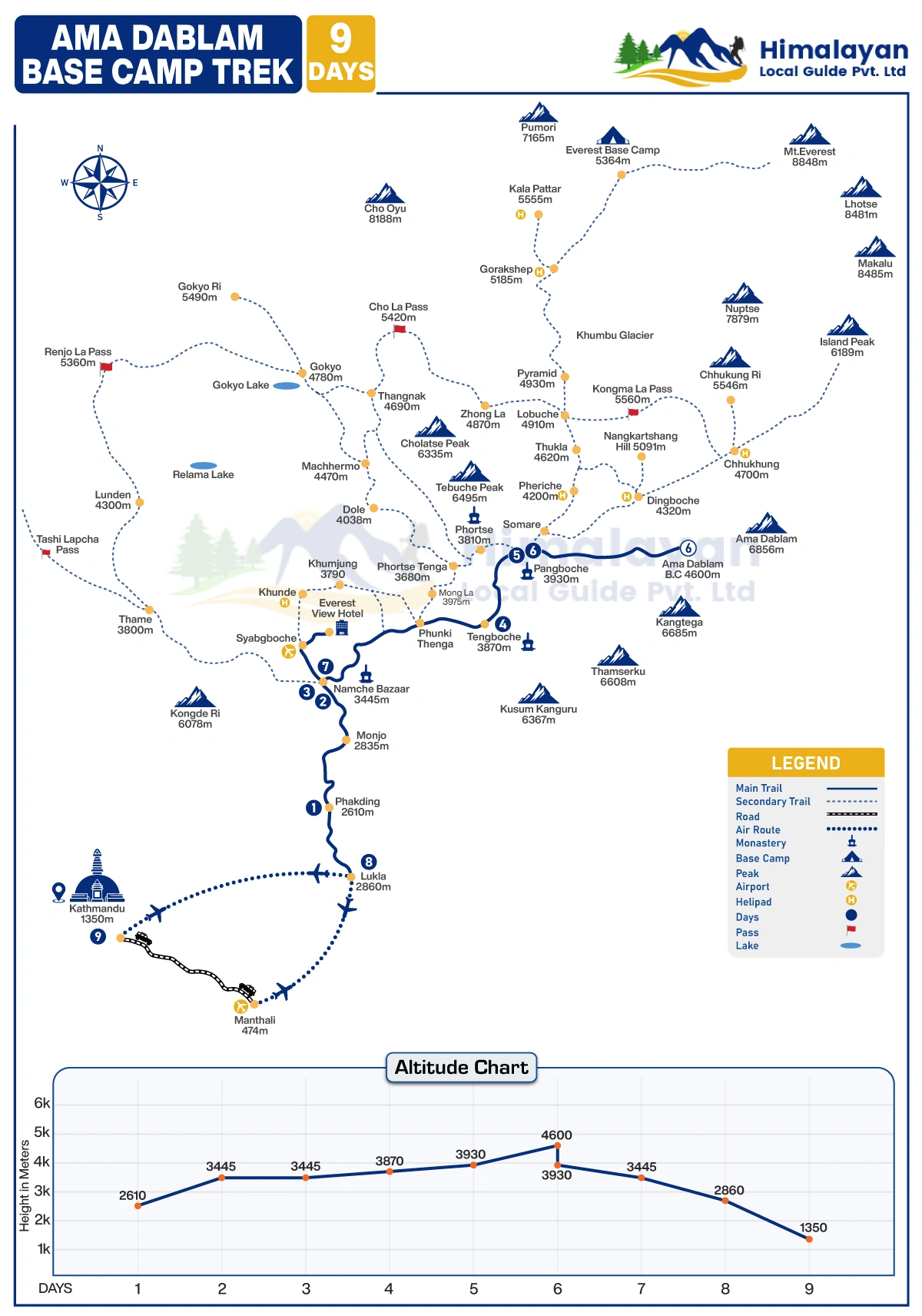 The journey begins in the vibrant town of Lukla, which is well-known for its unique and interesting airport, often referred to as the Tenzing Hillary Airport. From here, trekkers commence on a picturesque trip that follows the trekking trail alongside the Dudh Koshi River valley. Alongside this beautiful route, trekkers pass through a sequence of traditional local Sherpa villages, including Phakding, Monju, Jorsalle, Namche Bazaar, Khumjung, Tengbuche, Pangbuche, and Ama Dablam Base Camp.