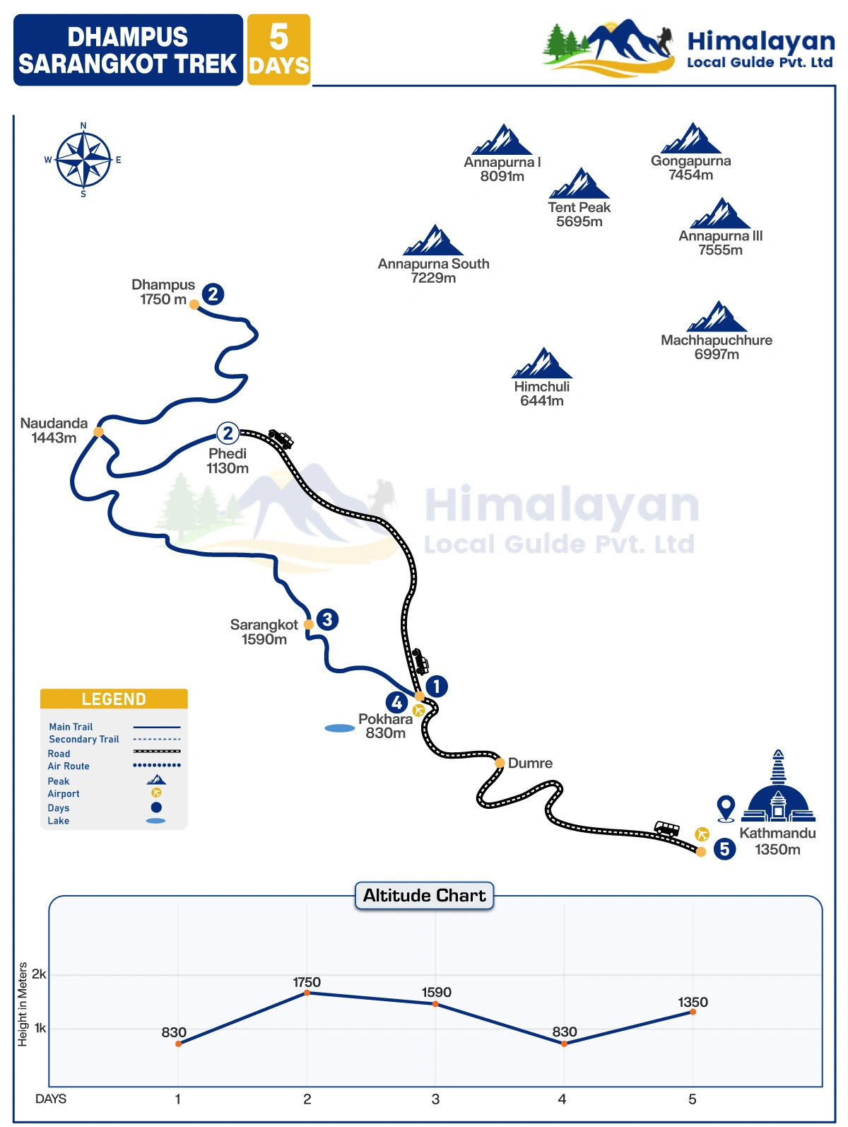 Dhampus Sarangkot Trek Itinerary in the west of Pokhara city is a popular destination. This trek provides travel around to opportunity to see the Rhododendron trees, pine trees, many different kinds of trees, wildlife animals, and Domestic animals with Delightful Himalayan Panoramic Mountain view as like Dhaulagiri Himal ( 8,165m), Annapurna south ( 7,215m), Himalchuli ( 6,465m), Annapurna I ( 8,091m), Machhapuchare Himal (6,995m) and Lamjung Himal, etc