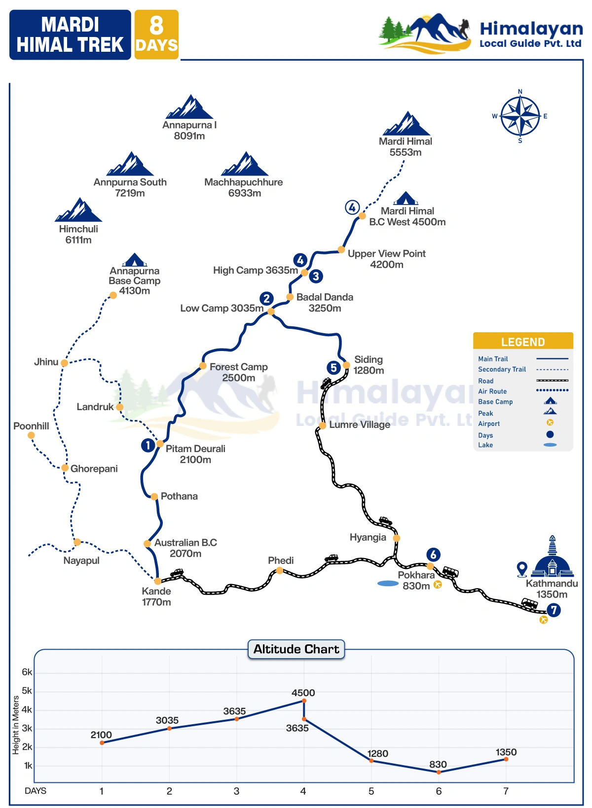 Along the trekking route, you will pass the delightful villages of Kande, Australian Camp, Pitam Deaurali, Forest Camp, High Camp, and reach Mardi Himal Base Camp (4500 meters). The high altitude is relatively low compared to other trekking spots such as the Manaslu Circuit, Thorong La Pass, and EBC Trek.