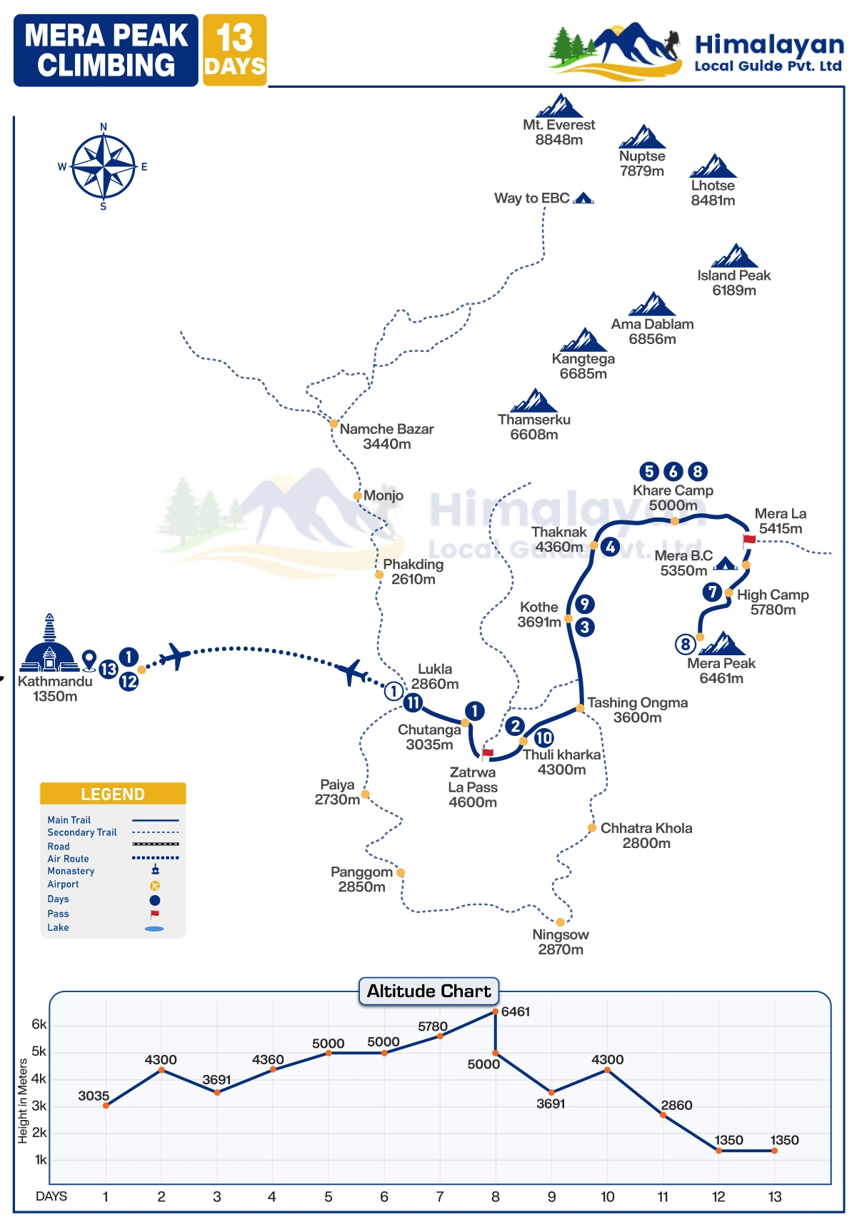 We have organized 13 days of Mera Peak climbing (6,461m/ 21,190ft) for a short time and we are delighted to share our experience with you all, our previous clients were truthfully pleased with our steady and well-designed sample itinerary without having had any of issues during the trip of climbing with this plan, it’s very much like as usual itinerary but no any extra or acclimatization days are being added. Therefore, this Mera Peak climbing goes through the attractive Hinku Valley, following the archival local Sherpa settlements of Lukla, Chutang, Thuli Kharka, Kothe, and Khare.