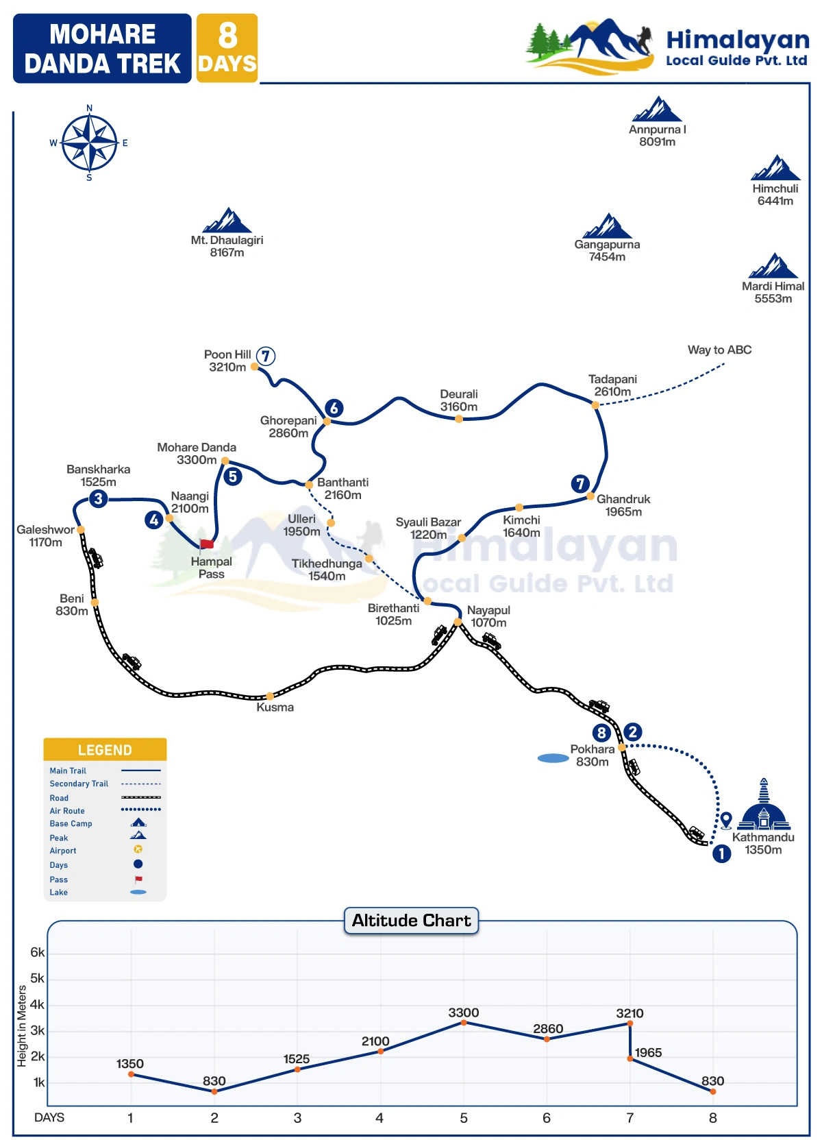 A short Mohare Danda Trek Itinerary begins with UNESCO World Heritage sites in Kathmandu Valley and a scenic drive to Pokhara. We lead you passing the bank of Kali Gandaki riverside, green forest, delightful villages, rice fields, diversity, and unique culture. This trek offers a local tea house and develops an eco-tourism system. This place is the motherland of the latest well-known Mahabir Pun, where you can find facilitated; with electronic communication.