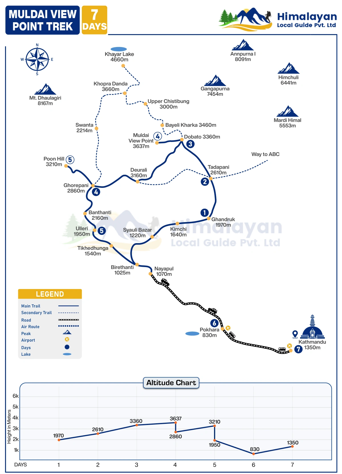 Short Muldai Hill trekking provides you the unique experience to untouched terrain. The trekking trails passes through the ethnic local culture villages of Ghandruk, Tadapani, Dobato, and walk on the dense forests of Pine and rhododendrons and ridge lines capturing the delightful views of white snow-capped mountains. It is located an elevation at (3637meters/11,932ft) the Muldai view point trek has also chance to see the view of sunrise and sunset, where the valley field with clouds below and rays of the sun spill over the Himalayas in all its beauty along the view of unique deepest wonderful in the world without crowds.